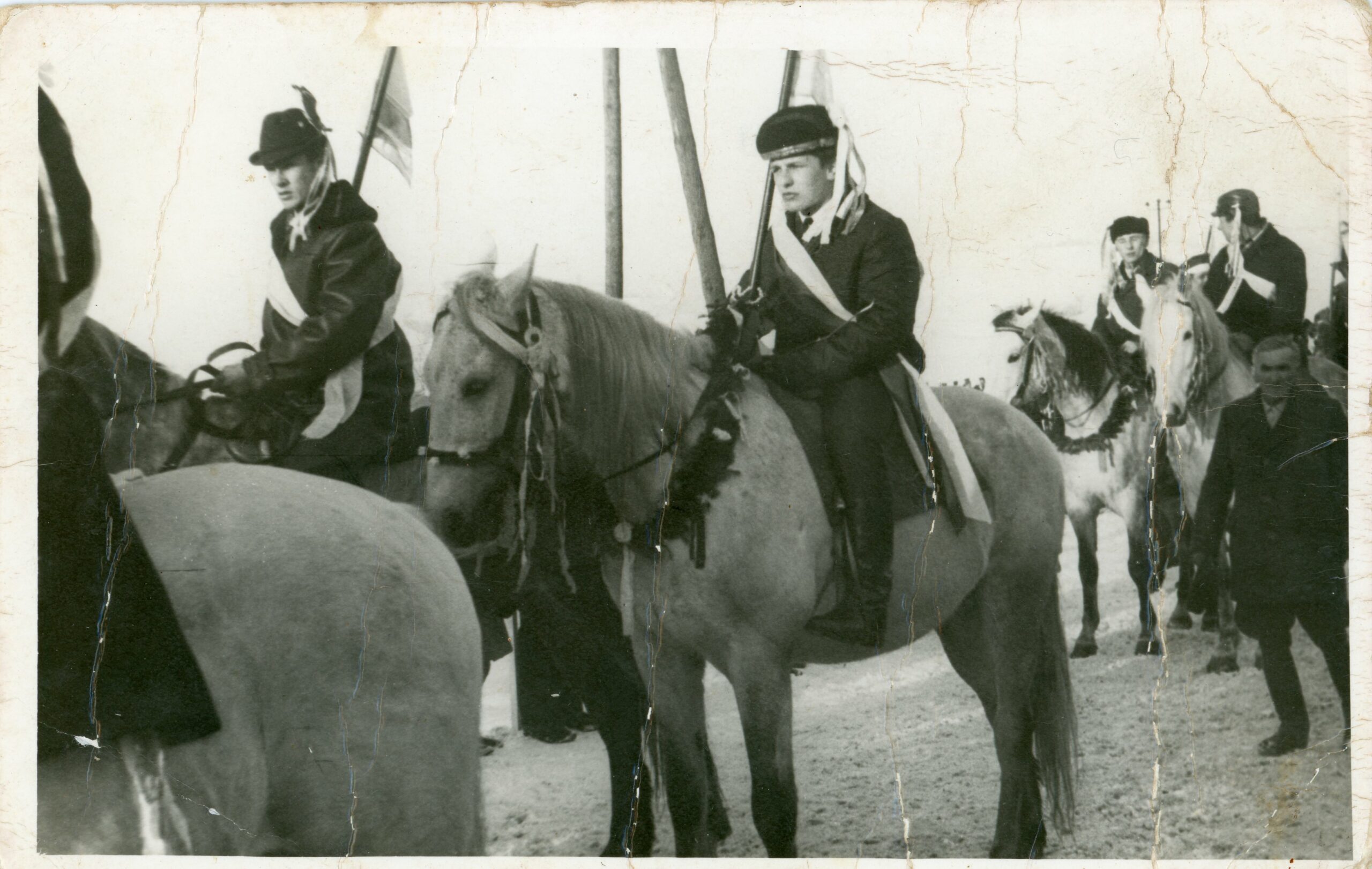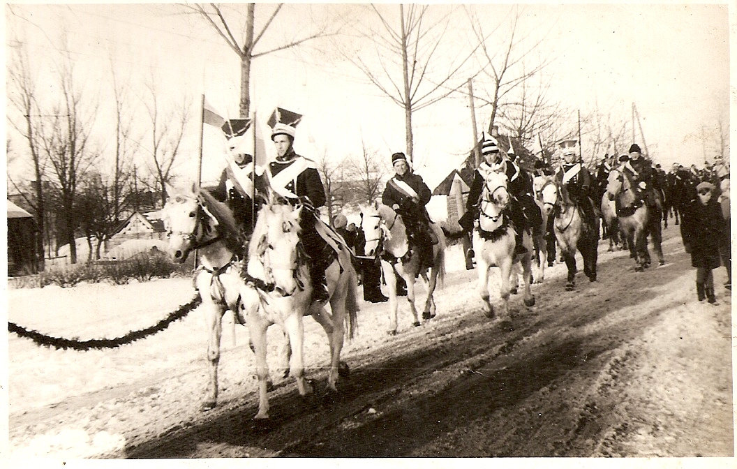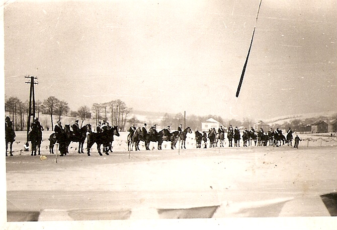 Banderia przed przejęciem Ramy Obrazu Matki Boskiej Częstochowskiej z Trzebowniska do Chmielnika. Na koniach m. in. Eugeniusz Szczęch i Stanisław Dykiel, 13 01.1971 roku