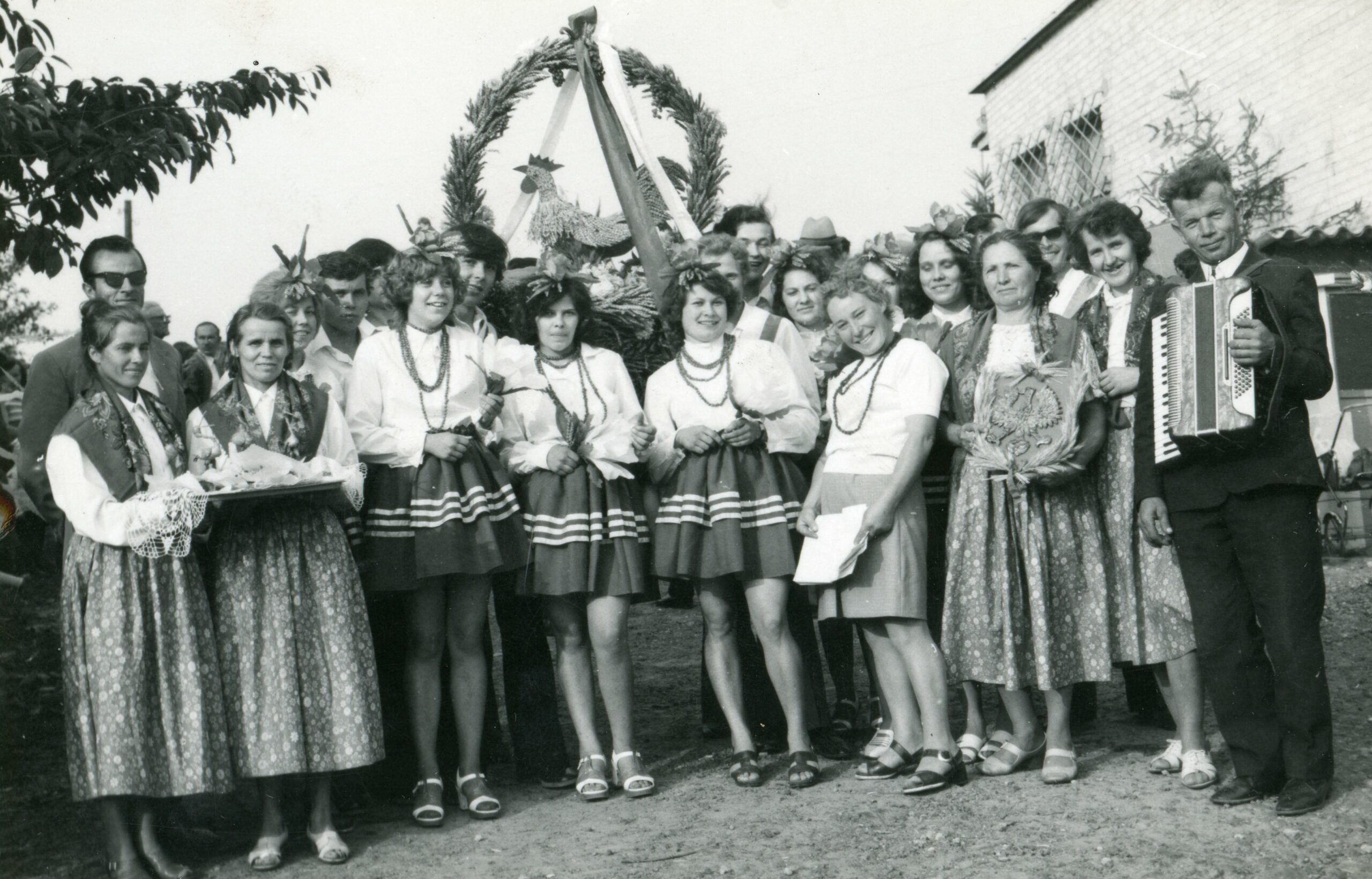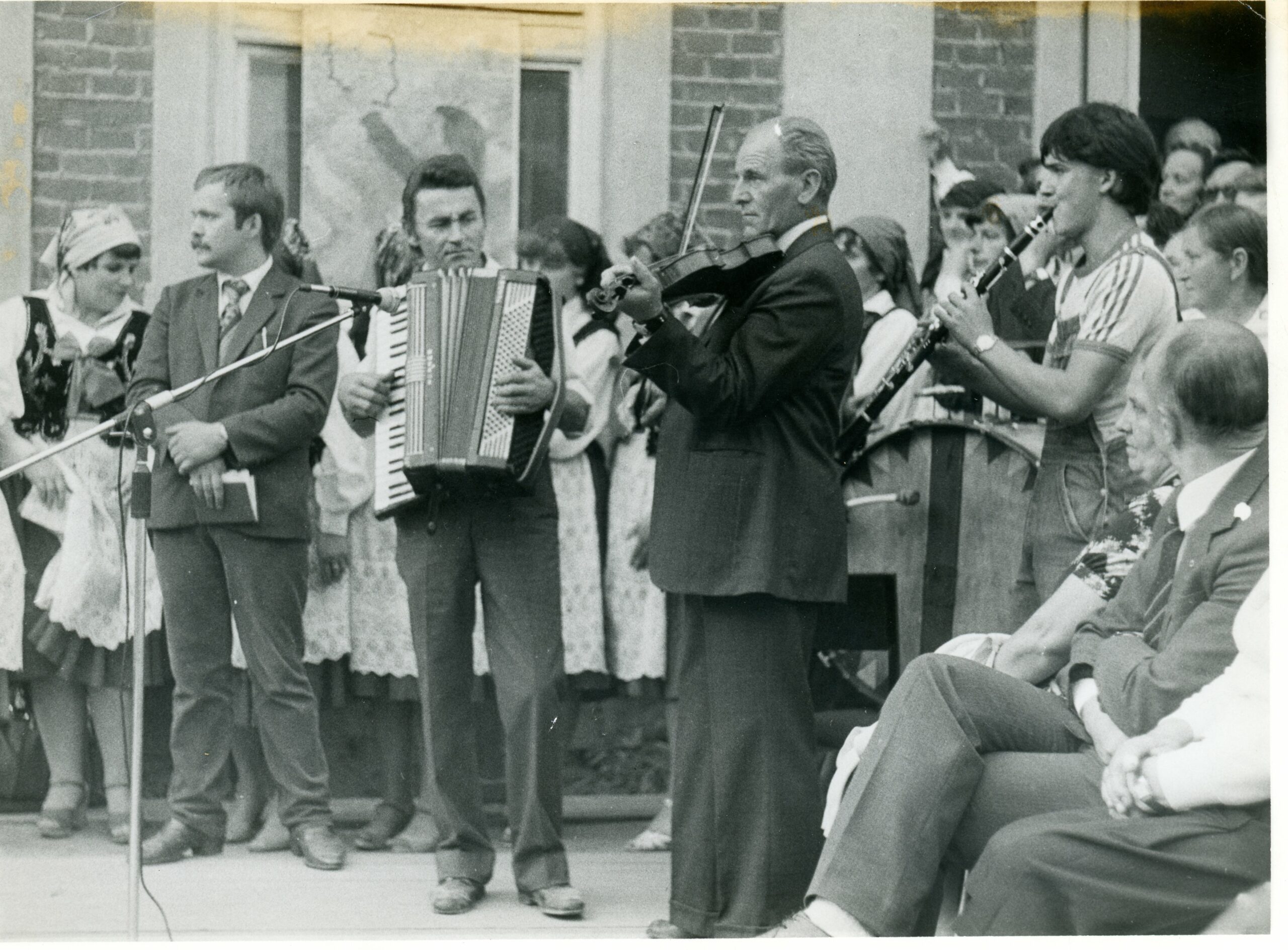 Dożynki w Chmielniku koło domu ludowego, w pierwszym planie m. in. Krzysztof Jasiński, Antoni Trawka (akordeonista), Antoni Cyrul (skrzypek), w drugim planie zespół śpiewaczy Pogórzanki z Zabratówki, połowa lat 80