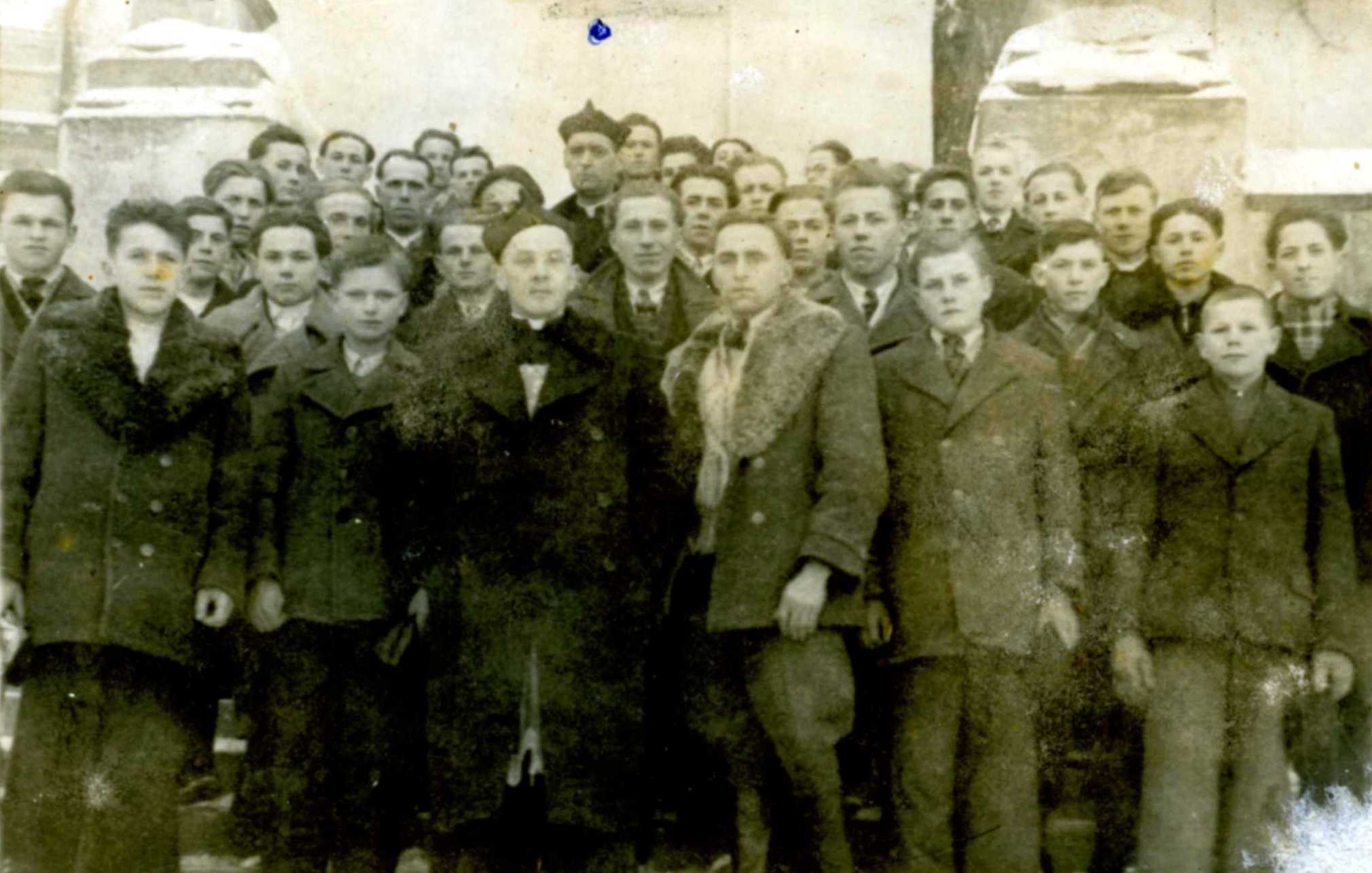 Młodzież i księża: ks. Antoni Ziobro i z tyłu ks. Jan Kuźniar, około 1942 roku